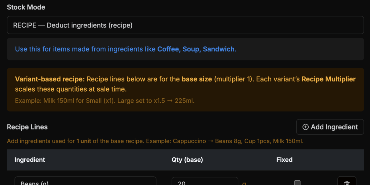Link menu items to recipes (milk, flour, cheese, etc.). Stock updates automatically