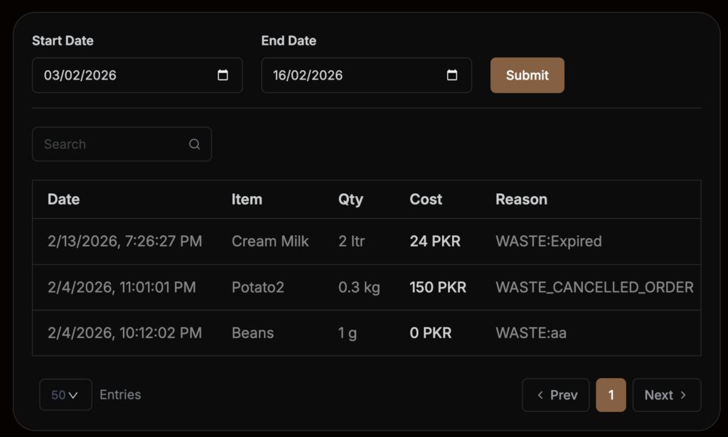 Record spoiled, burnt, or cancelled items in seconds.Wastage is deducted from inventory