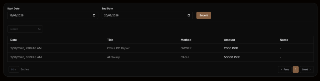 Record cash or bank expenses and include them in profit/loss reports — fully linked with shifts.