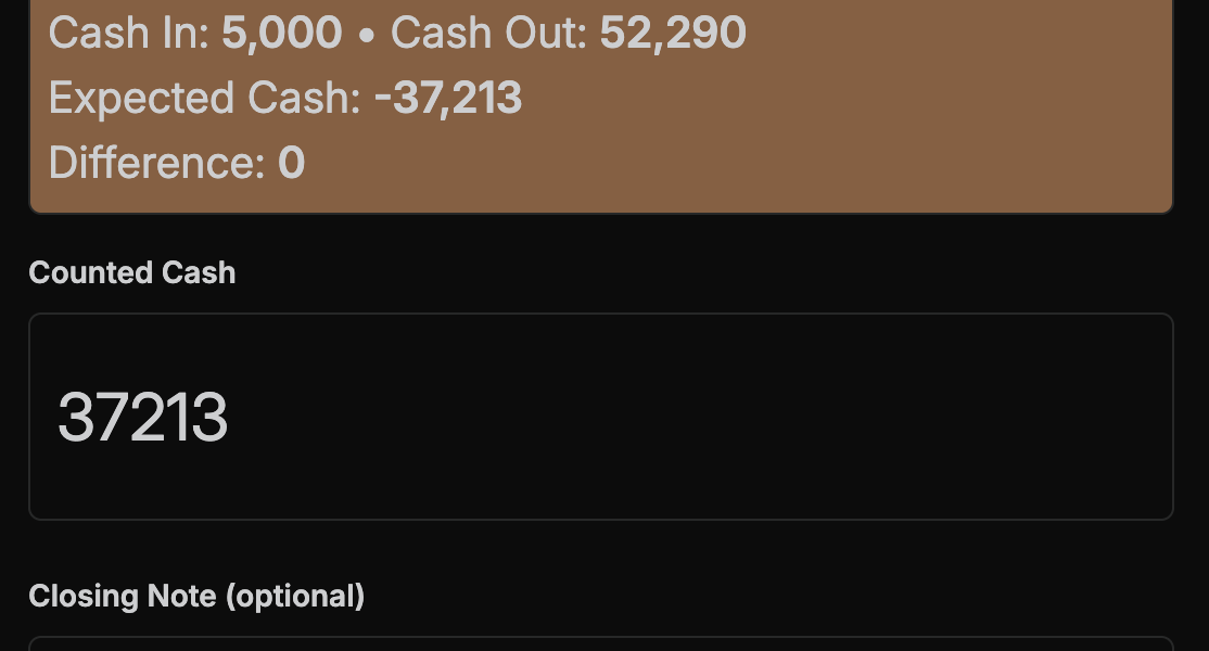 Track opening cash, cash-in, cash-out, expenses, and closing variance for every shift — automatically.