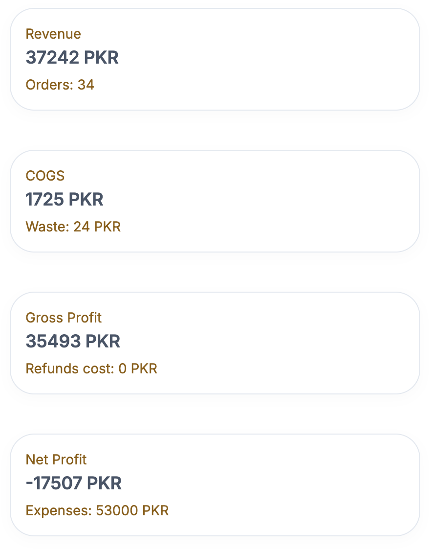Sales, cost, wastage, expenses — in one view